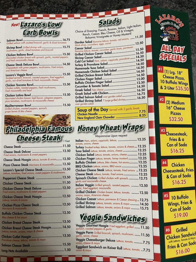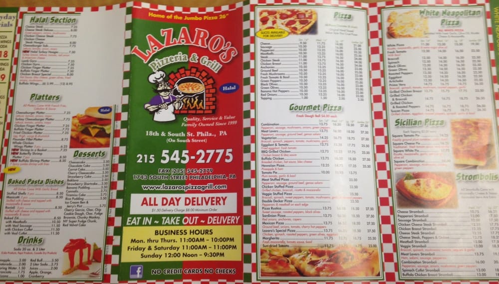 Welcome to Lazaro's Pizzeria and Grill, where the essence of Italian cuisine meets the charm of casual dining in Philadelphia. Located at 1743 South St, this local gem specializes in gourmet pizzas, from the classic Meat Lovers to the delightful Vegetarian, appealing to all taste buds.